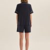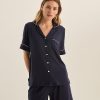 The Harper pyjama set in navy by Gingerlilly. Discover comfort and sustainability with our navy pyjama set crafted from luxurious modal. This eco-friendly fabric offers stunning softness and durability, pilling-resistance, and a hypoallergenic nature perfect for sensitive skin. With a short sleeve button-through top featuring pocket details and comfortable elasticated waist shorts, this set combines fashion with functionality. Experience the lasting quality and eco-conscious charm of Gingerlilly’s modal sleepwear collection.