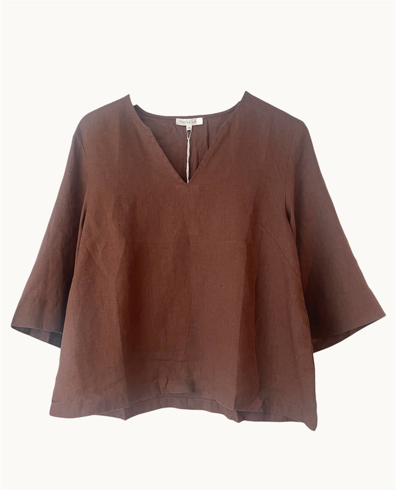 The Little Lies Andrea Top in a rich, earthy chocolate hue is the perfect trans-seasonal piece — effortlessly versatile for dressing up or keeping it casual. Crafted from 100% linen, it features a relaxed, classic fit with 3/4 sleeves and a flattering V-neckline. Its simple yet elegant design makes it a timeless style that looks beautiful on everyone.