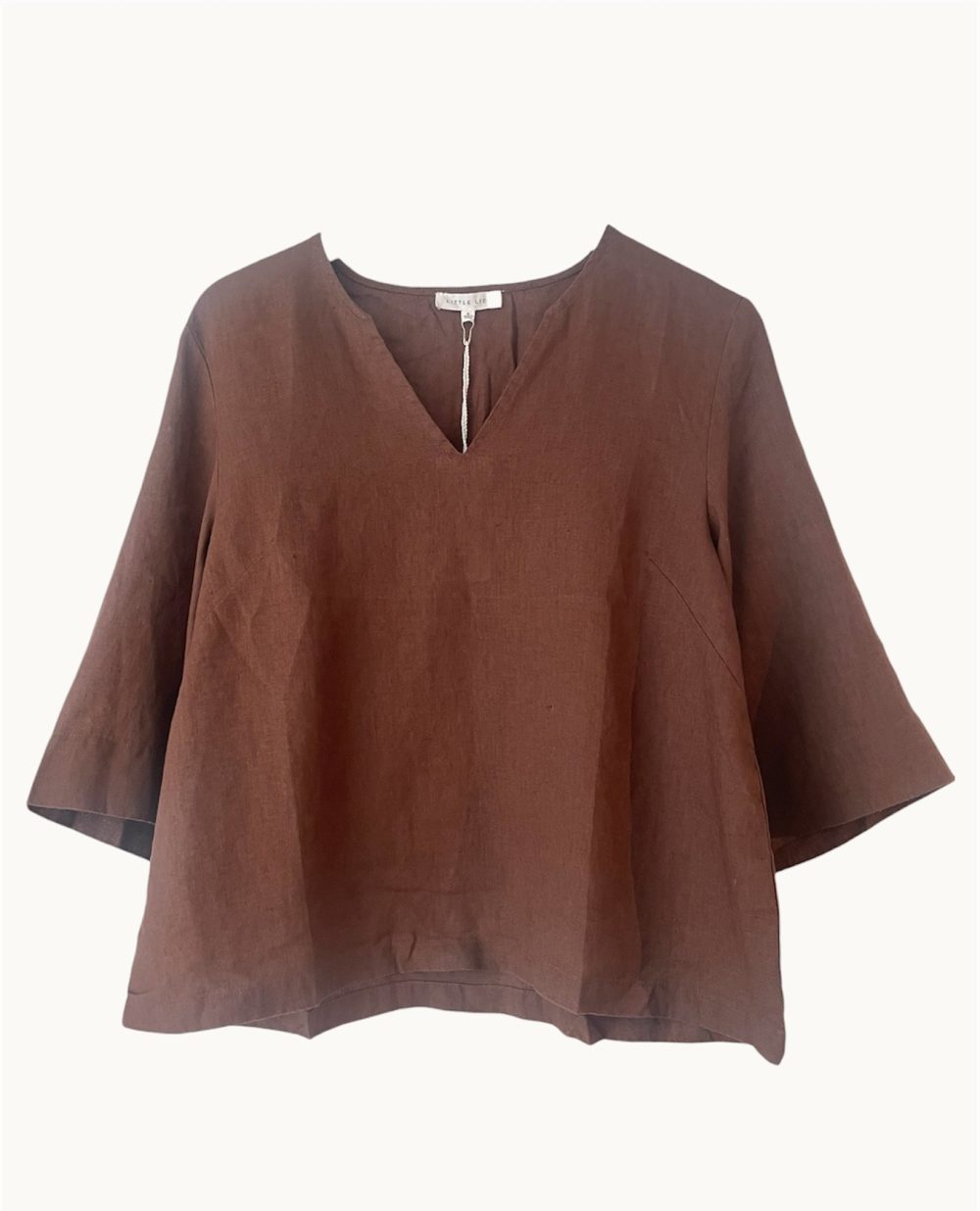 The Little Lies Andrea Top in a rich, earthy chocolate hue is the perfect trans-seasonal piece — effortlessly versatile for dressing up or keeping it casual. Crafted from 100% linen, it features a relaxed, classic fit with 3/4 sleeves and a flattering V-neckline. Its simple yet elegant design makes it a timeless style that looks beautiful on everyone.