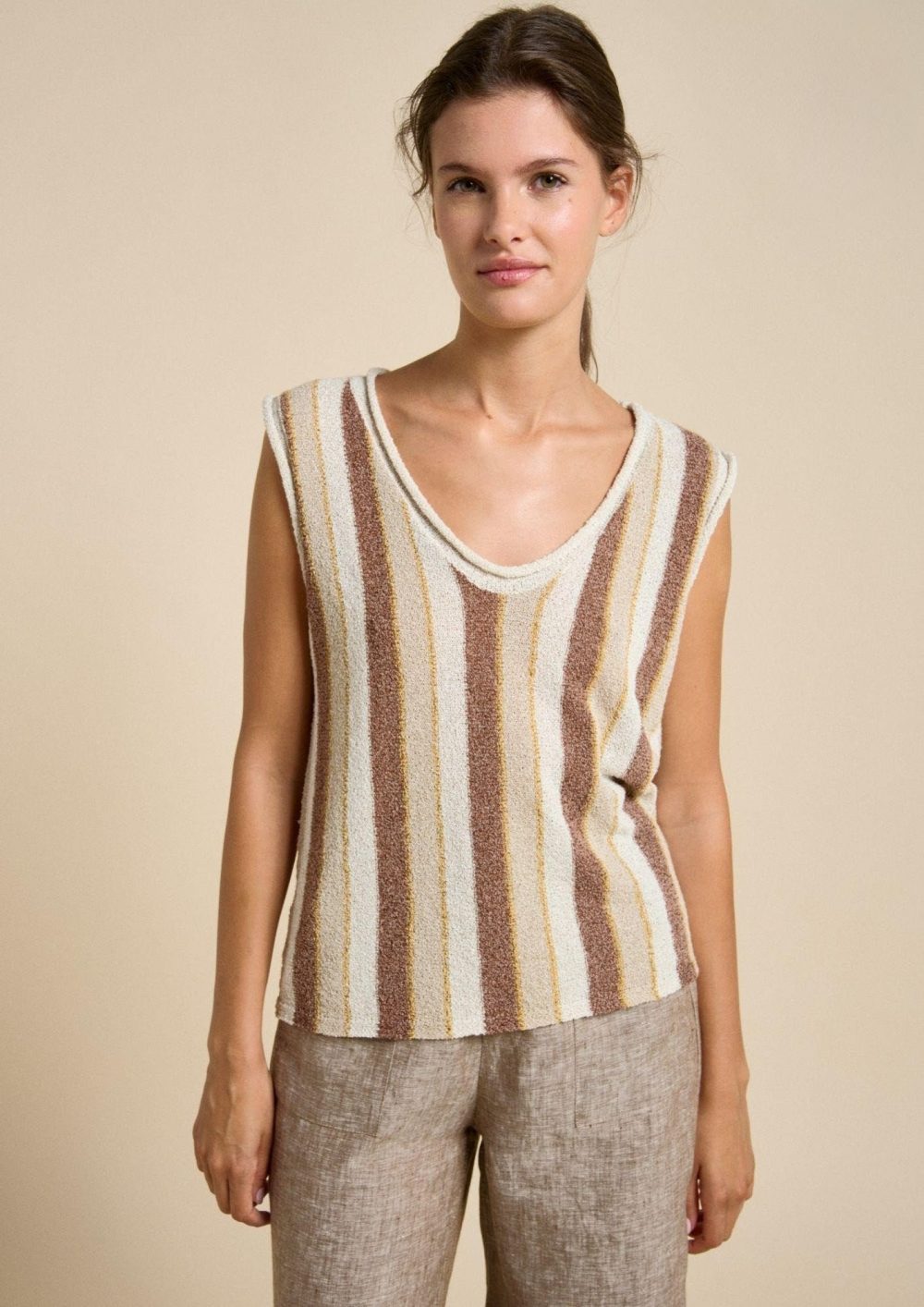 Introducing the Little Lies Clovelly Tank — featuring a retro flair of stunning chocolate, caramel and butter vertical stripes. In a beautiful soft textured fabric, this tank is endlessly versatile and perfect for any season or occasion. Pair back with either of our new Bondi Pants in Beige or Chocolate.