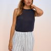 The Mattie Stripe Pants feature a relaxed fit, elasticised waistband with tie front, wide legs, and the all-important side pockets….offering comfort and style in equal measure. Pair the Mattie Stripe Pants with the Navy Spring Tank as featured. For an elevated outfit for a more formal summer occasion co-ordinate with the Mattie Stripe Top.