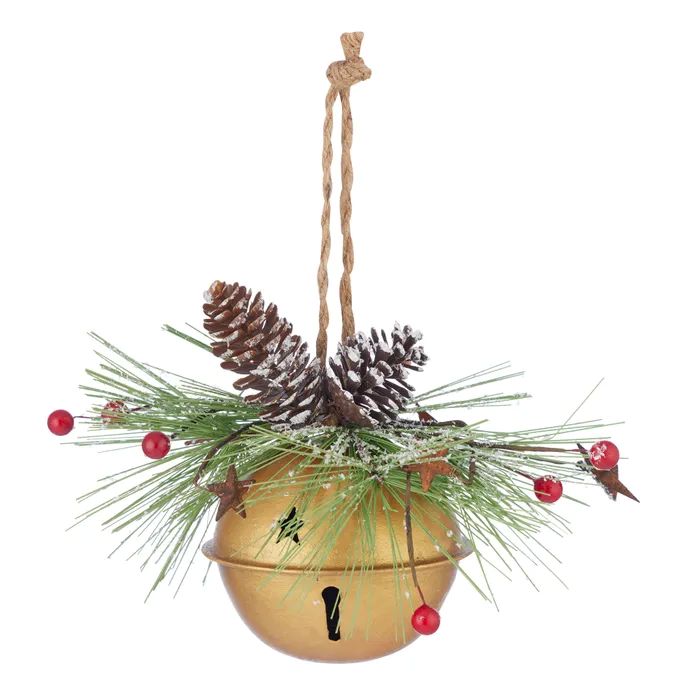 Add a touch of festive elegance to your holiday décor with this Gold Hanging Bell Ornament. Crafted from metal and adorned with frosted pinecones, holly berries, and pine sprigs, it captures the magic of Christmas in every detail. Hang it on your tree, wreath, or door handle for a warm, traditional look that shimmers with holiday cheer.