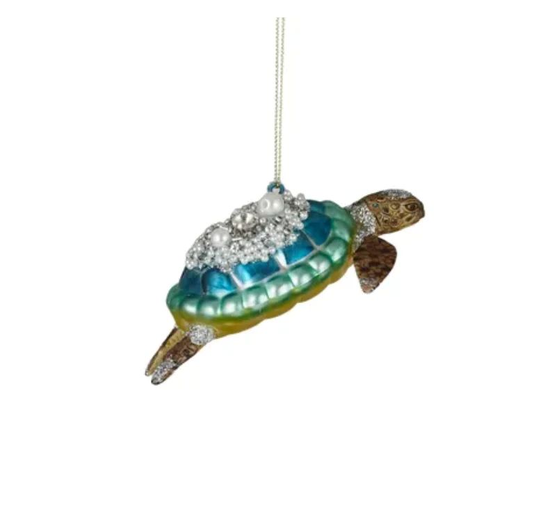Add a splash of coastal charm to your festive décor with this beautifully detailed turtle ornament. Crafted from glass and finished with a vibrant, jewel-toned shell in shades of blue, green, and gold, it’s accented with pearl-like embellishments and realistic texturing. At 12cm, it’s perfectly sized for tree decorating while still making a visual impact.